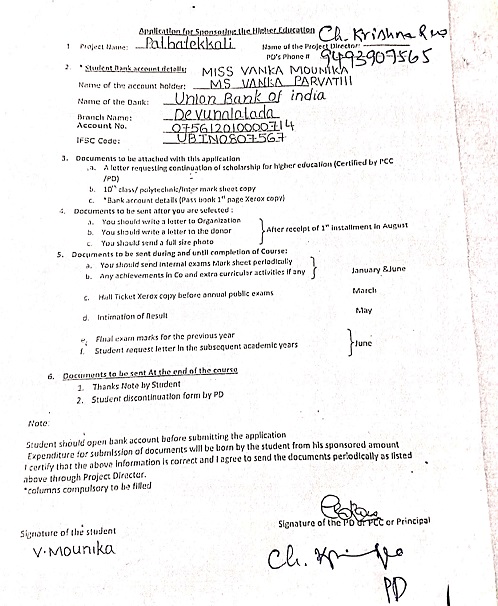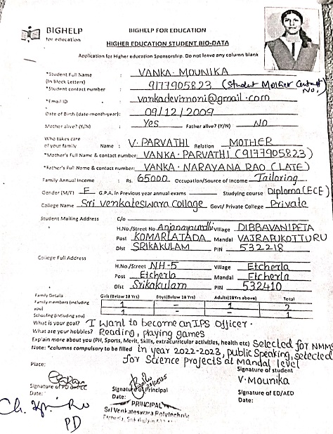 Bighelp thanks Subramanyam Boyapati for kindly sponsoring the education of Mounika Vanka. |