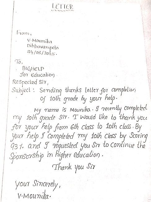Bighelp thanks Anitha Nagaralu for kindly sponsoring the education of Mounika Vanka. |