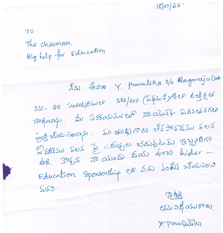 Bighelp thanks Pranavi Gollamudi for kindly sponsoring the education of Pravalika Yata. |