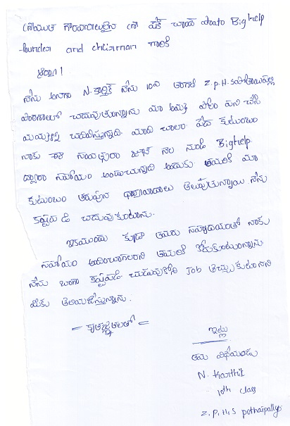 | Bighelp thanks Tejesh Yelakanti for kindly sponsoring the education of Karthik Neeradi. |