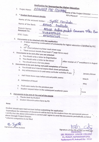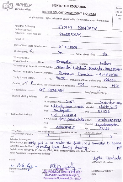 Bighelp thanks Pawan Gupta for kindly sponsoring the education of Jyothi Bondada. |