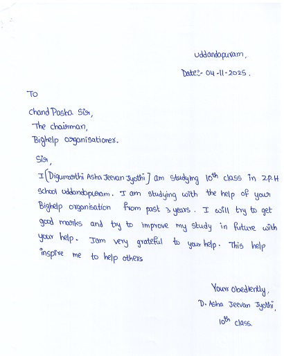 | Bighelp thanks RAO NALLAMOTHU for kindly sponsoring the education of Asha Jeevan Jyothi Digumarthi. |