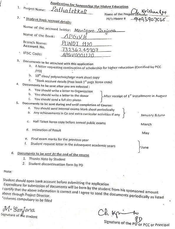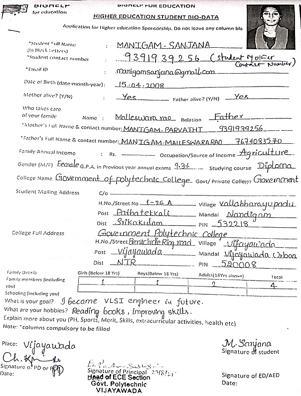Bighelp thanks Venkata Suresh Alapati for kindly sponsoring the education of Sanjana Manigam. |