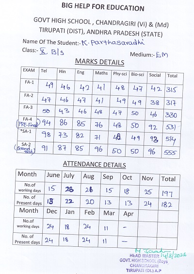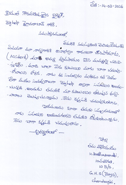 | Bighelp thanks Rakesh Dama for kindly sponsoring the education of Parthasaradhi Korutooru. |