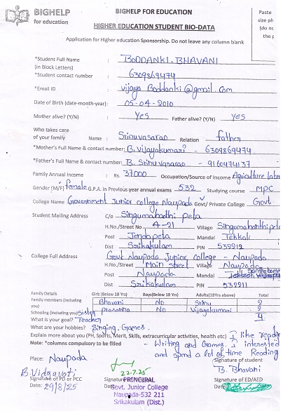 Bighelp thanks NESSP Inc for kindly sponsoring the education of Bhavani Boddanki.
