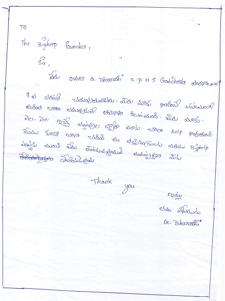| Bighelp thanks Swapna Kala for kindly sponsoring the education of Bharathi Gompa. |