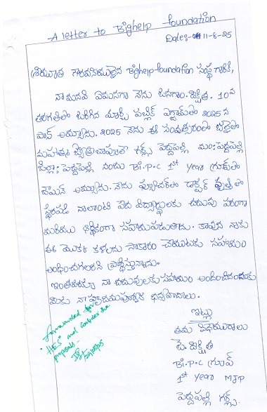 Bighelp thanks Anita Srinivasan for kindly sponsoring the education of Deekshitha Janagam. |