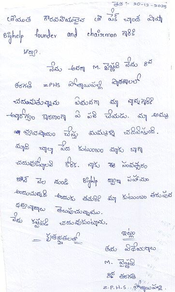 Bighelp thanks Priyanka Kodiripaka for kindly sponsoring the education of Vaishnavi Mengaram.