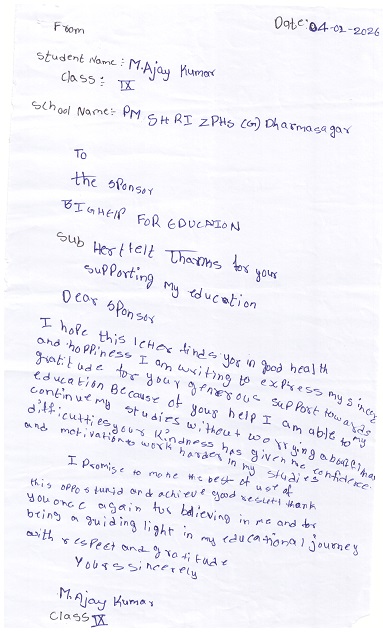 Bighelp thanks Priyanka Pradhan for kindly sponsoring the education of Ajay Mupparapu.