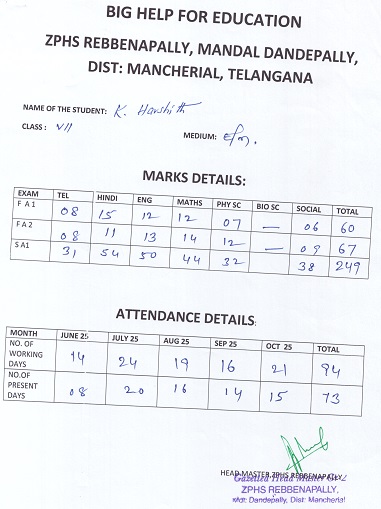 Zilla Parishad High School Rebbanpally Dandepally Mandal Mancherial Dist. T.S, India 504206 |