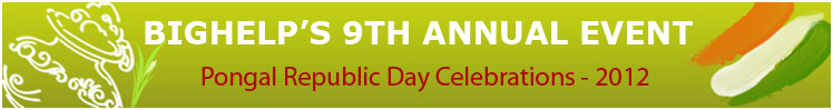 On January 7, 2012, Bighelp held their 9th annual fundraiser Pongal-Republic Day Celebrations at Canton High School, Canton, MA. This year’s event was attended by over 1400 people and lasted nearly ten hours. The event started with Math Bee, Spelling Bee, Art, and Coloring for kids and a Rangoli contest for adults. The Cultural programs were hosted by 6 energetic young students Avinash Gundimeda, Monica Nagalla, Prashant Maddineni, Sanjay Batchu, Abhiram Rao and Madhumathi Prakash who are also part of Bighelp's youth group YouthHelp. A colorful mix of songs and dances, patriotic, devotional, filmy, classical and modern, performed by over 200 children and adults made up the cultural programs. Though everyone thoroughly enjoyed the exciting day, they knew that the real reason behind the event was to extend Bighelp’s mission, and they did just that. A total of $21,000 was raised to continue the organization’s projects in the upcoming year.