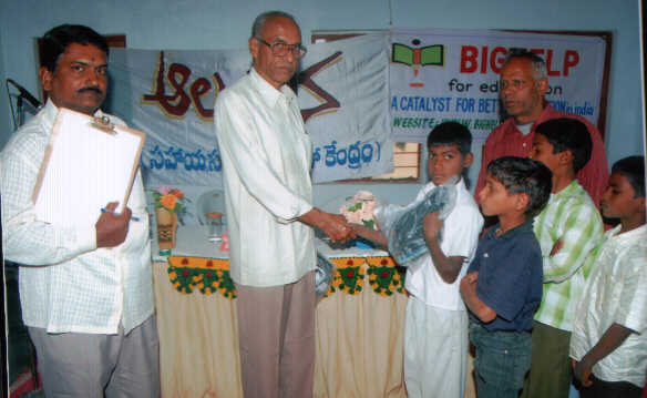 | Clothes distribution was held on January 31st, 2006. Mandal education officer attended the function as chief guest and presided by the Managing Trustee of Bighelp. AED (A), secretary with other members of " AlAMBANA", colony welfare association president, elders of colony, teachers and students of ALANBANA and Indian citizen society members. Then the clothes were distributed to the children, who were greatly delighted with them. While the distribution was going on, the members spoke and stressed the need of education to children and praised the service rendering by " AlAMBANA" unit. Members have also extended thanks to "Bighelp" organization charity of providing dresses to children of AlAMBANA. | |
