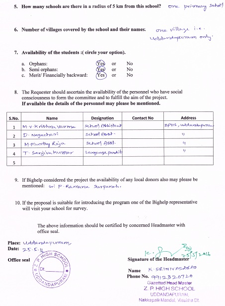 This project has been surveyed Mr.K.Ch. Krishna Murthy (project director of Godicherla Project )during month Mar/April 2016. He made personal visit to this village, talked to the children, parents and school staff to assess the need. The executive body headed by the Bighelp President Mr. Chand Pasha has reviewed the need for the support and approved the project.