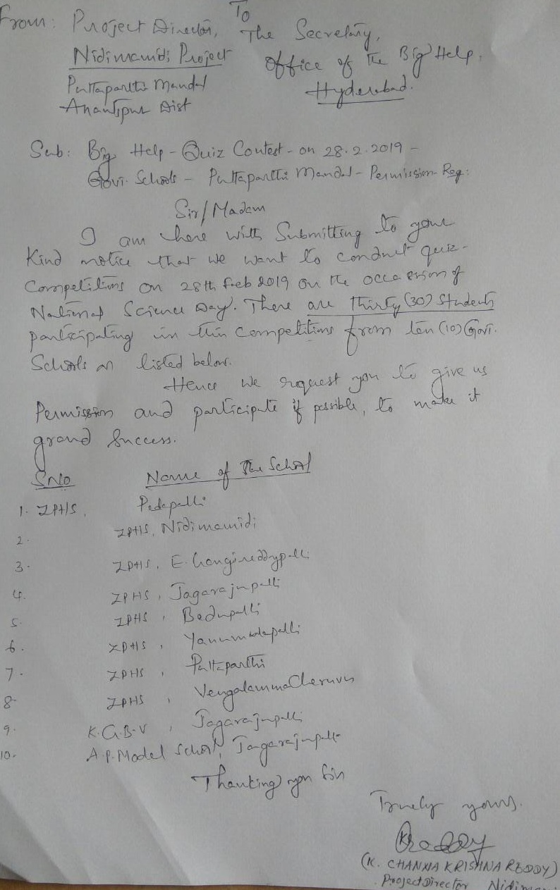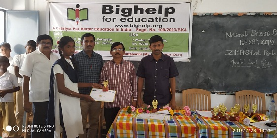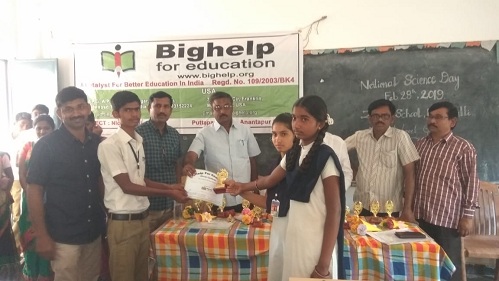 | Bighelp has conducted a quiz program in Zilla Parishad High School Pedapalli, Puttaparthi Mandal, Anantapur district at Mandal level on 28th February 2019 to familiarize the students and foster a competitive spirit among students. Total 7 schools participated in this quiz program. From each school 3 students have participated. Quiz program included subject based questions as well as general knowledge. Following schools participated in Quiz program 1. Zilla parishad High School Nidimamidi 2. Zilla Parishad High School Pedapalli 3. Zilla Parishad High School Gangireddipalli 4. A.P. Model School Jaggarajupalli 5. Zilla Parishad High School Bedupalli 6. Zilla Parishad High School Eanumalapalli 7. Zilla Parishad High School Puttaparthi Later Participants from 1st, 2nd and 3rd place winning schools presented with mementos and certificates and a shield presented to the prize winning schools. 1st Place winning School : Zilla Parishad High School Pedapalli 2nd Place winning School: Zilla Parishad High School Nidimamidi 3rd Place winning School: A.P. Model School Jaggarajupalli |
