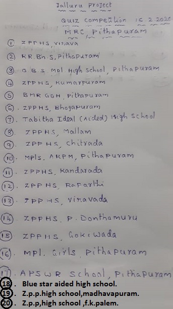 | Bighelp has conducted a quiz program in Zilla Parishad High School,Mallam, Pithapuram Mandal, East Godavari district at Mandallevel on 16th February 2020 to familiarize the students and foster a competitive spirit among students. Total 20 schools participated in this quiz program. From each school, 5 students have participated. Quiz program included subject based questions as well as general knowledge. 1. BMR Govt. Girls High School, Pithapuram 2. Municipal Girls High School, Pithapuram 3. Zilla Parishad High School Bhogapuram 4. Rajiv Gandhi Municipal High School 5. Zilla Parishad High School Kumarapuram 6. Zilla Parishad High School P. Donthamurru 7. Zilla Parishad High School Virava 8. Zilla Parishad High School Mallam 9. R.R.Bh.R.G. High School 10. Zilla Parishad High School Kandarada 11. Zilla Parishad High School Virawada 12. Zilla Parishad High School Raparthi 13. Zilla Parishad High School Gokiwada 14. Zilla Parishad High School Chitrada 15. O.B.S. Mpl High School, Pithapuram 16. Tabitha Ideal High School 17. Mpls. AKPM, Pithapuram 18. A.P.S.W.R. School, Pithapuram 19. Zilla Praja Parishad High School, Madhavapuram 20. Zilla Praja Parishad High School, F.K. Palem Later Participants from 1st, 2nd and 3rd place winning schools presented with mementoes and certificates and a shield presented to the prize winning schools. 1st Place winning School : Zilla Parishad High School Virawada 2nd Place winning School: Zilla parishad High School Virava 3rd Place winning School: Rajiv Gandhi Municipal High School |
