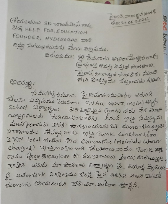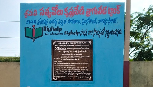 Bighelp has constructed a water tank in S.V.A.R. Govt. Model High School, Pylon Colony, Nagarjunasagar, Nalgonda District, Telangana. The water tank construction has been under taken by Bighelp with the support of Sri Satyavolu Surya Prakash in order to cater the most essential need of drinking water to the students.