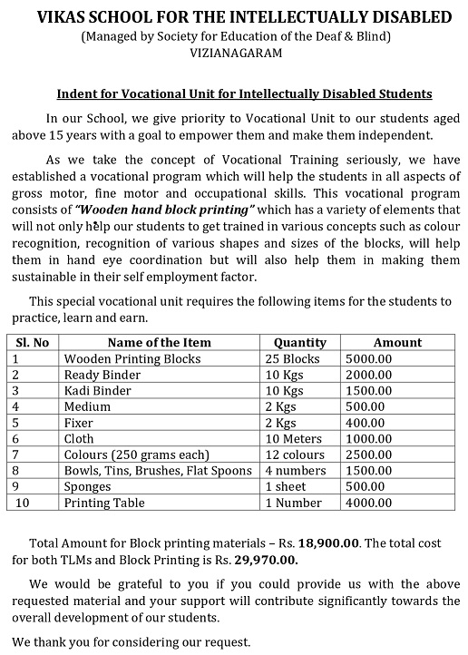 Bighelp Donated Teaching, learning material, Play material and Block printing to Vikas school for the Mentally Retarded, Vizianagaram, AP which is providing free education to Mentally challenged children.