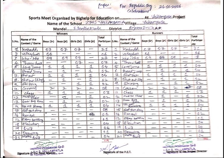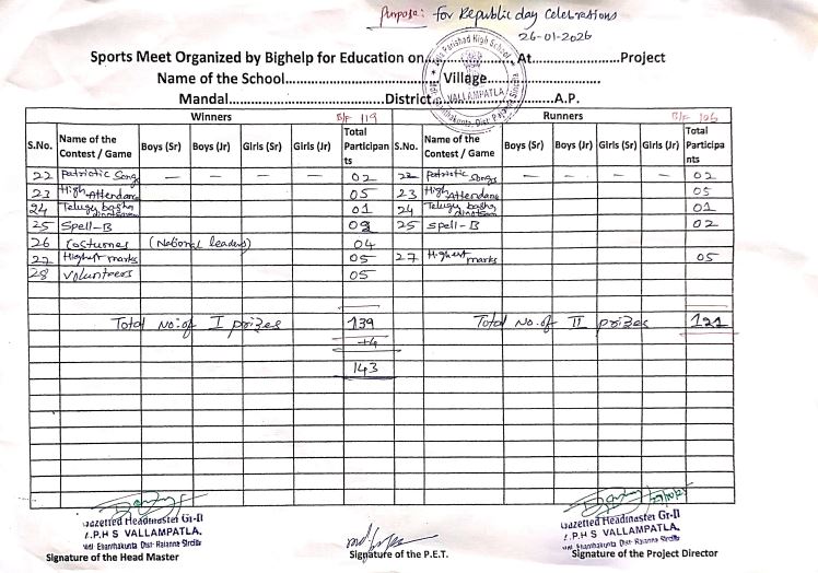 | Bighelp organized a sports meet for the students of Vallampatla Zilla Parishad High School on 26th January 2026, with the objective of promoting physical fitness, endurance, and overall well-being among students. |