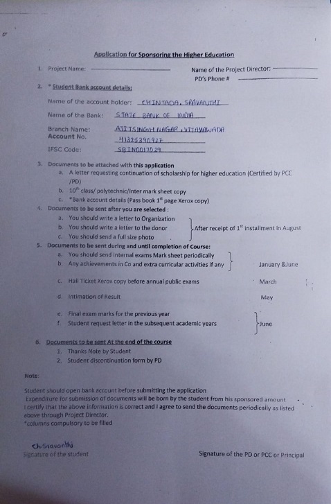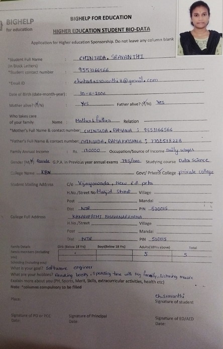 | Bighelp thanks Satheesh & Manjula Donthy for kindly sponsoring the education of Sravanthi Chintada. |