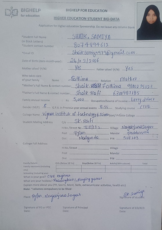 | Bighelp thanks Anuradha Kancharla for kindly sponsoring the education of Samiya Shaik. |