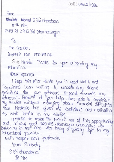 | Bighelp thanks Bindu Wadhwa for kindly sponsoring the education of Sirichandana Sorupaka. |