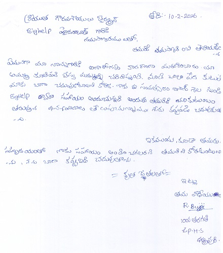 | Bighelp thanks Basaveshwar Gunda for kindly sponsoring the education of Bujji Reddy. |