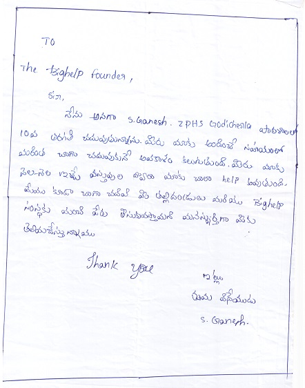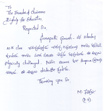 | Bighelp thanks Sarath Jarugula for kindly sponsoring the education of Ganesh Senapathi. |