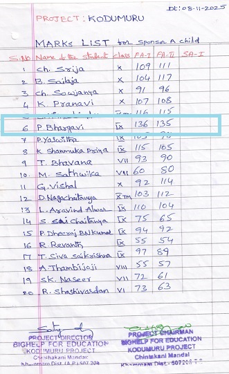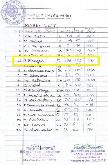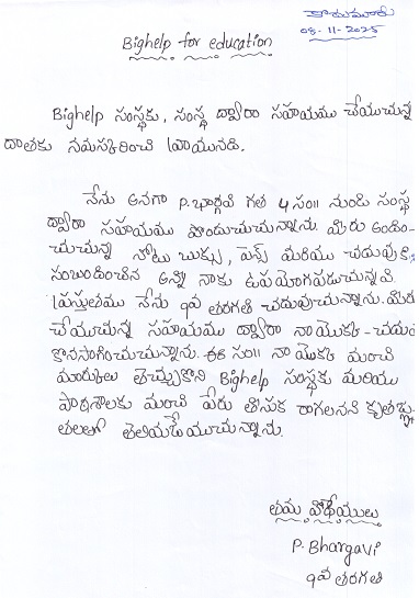 | Bighelp thanks Vamshi Noothi for kindly sponsoring the education of Bhargavi Palvancha. |