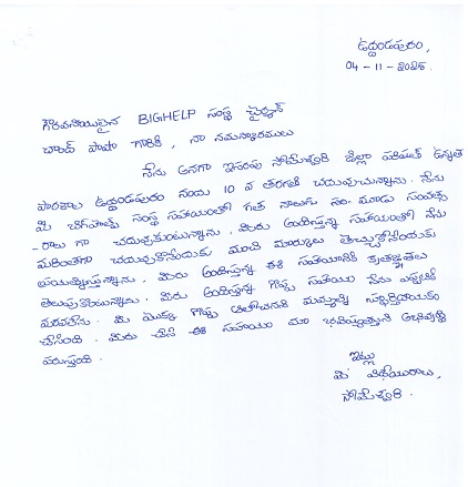 | Bighelp thanks Srinivas Tolety for kindly sponsoring the education of Someswari Isarapu. |