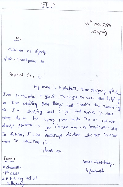 | Bighelp thanks Venugopal Pittala & Deepika Pabbathi for kindly sponsoring the education of Sharmila Uma Naga Durga Ravithreyini Kandukuri. |