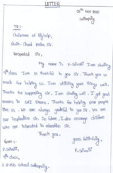 | Bighelp thanks Sriya Vuppala for kindly sponsoring the education of Srivalli Pantangi. |