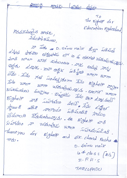 | Bighelp thanks Varma & Gayatri Saripalli for kindly sponsoring the education of Srinu Naik Desavath. |