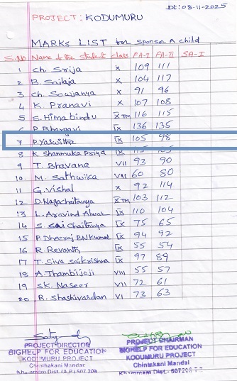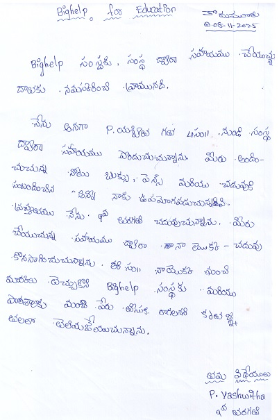 | Bighelp thanks Bighelp North Carolina Chapter for kindly sponsoring the education of Yaswitha Puttabanthi. |