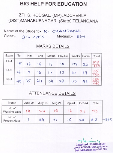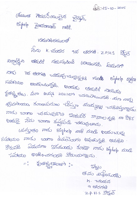 | Bighelp thanks Adinarayana S for kindly sponsoring the education of Chandana Kummari. |