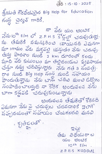 Bighelp thanks Praveen Kumar Valapadasu for kindly sponsoring the education of Ambica Maltunkar.