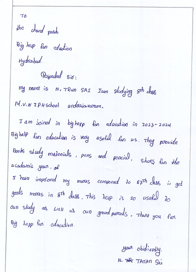 | Bighelp thanks Shravan Vallala for kindly sponsoring the education of Tharun Sai Eswar Nandigam. |