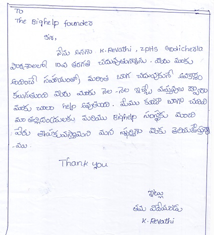 | Bighelp thanks Anand B Bachina for kindly sponsoring the education of Revathi Kona. |