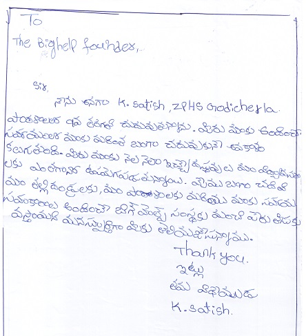 | Bighelp thanks Chandrasekhar Seelam for kindly sponsoring the education of Sathish Kolli. |