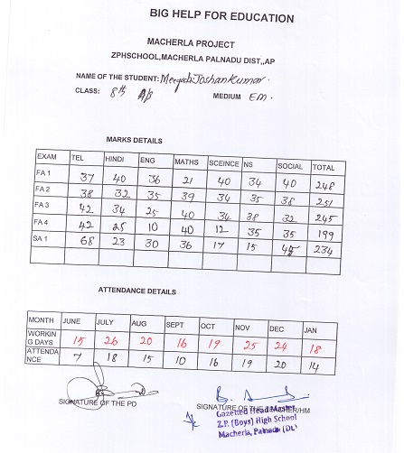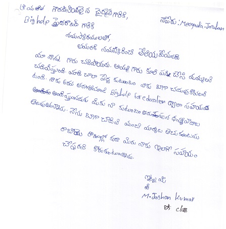 | Bighelp thanks Satheesh & Manjula Donthy for kindly sponsoring the education of Joshan Kumar Meegada. |
