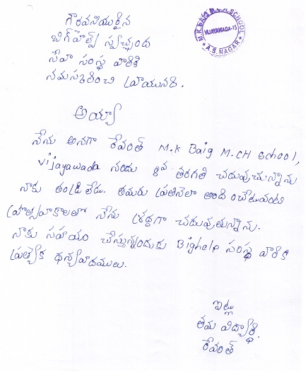 Bighelp thanks Manikyamba Immidisetti for kindly sponsoring the education of Revanth Saggila.