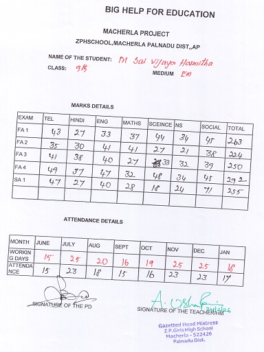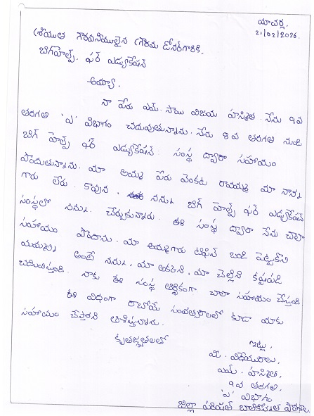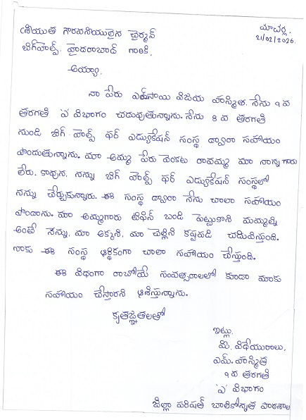 Bighelp thanks Prashanth Kumar Purshotam for kindly sponsoring the education of Sai Vijaya Hasmitha Magam.