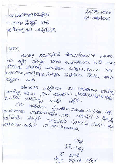 Bighelp thanks Priyanka Pradhan for kindly sponsoring the education of Hashma Shaik.