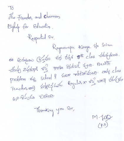 | Bighelp thanks Namaanisree for kindly sponsoring the education of Kavya Rayavarapu. |