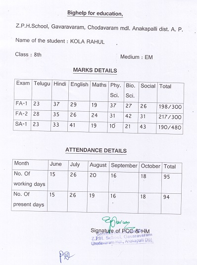 Bighelp thanks Raga Chilakamarri for kindly sponsoring the education of Rahul Kola.