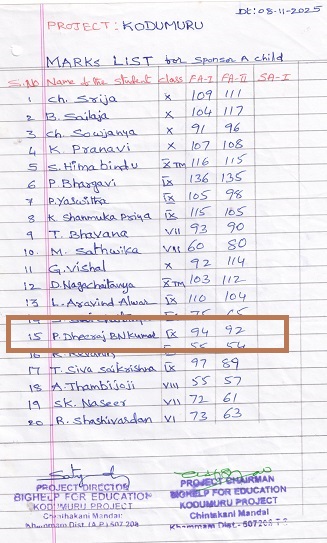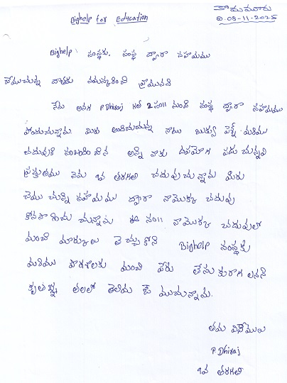 Bighelp thanks Rashmi Kumar for kindly sponsoring the education of Dheeraj Bhargav Peramasani.