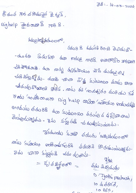 Bighelp thanks Sai Kiran Gundala and Kamal Anand for kindly sponsoring the education of Jyothi Prakash Bandaru.