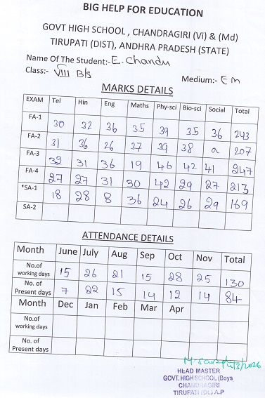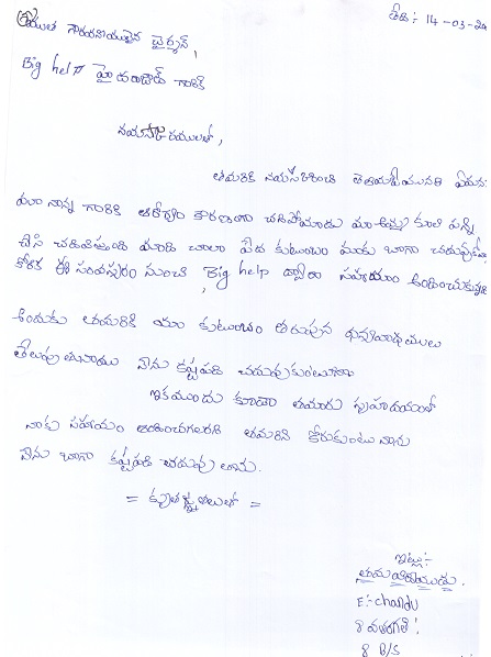 Bighelp thanks Suneel Pentala for kindly sponsoring the education of Chandu Eguvaputhuru.