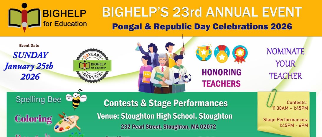 | There will be Spelling Bee, Rangoli and Coloring Contests and fun-filled Cultural Programs on the day of event. Register for contests. Submit RSVP to attend the event The above link lets you submit your RSVP and register for Spelling Bee, Coloring and Rangoli contests. It also gives you an option to sign up as a volunteer or sign up your child for YouthHelp team. The due date to register for Spelling Bee, Coloring and Rangoli Contests is 22-Jan-2026 at 5:00 PM ET. However we recommend you to register as soon as possible. We are looking for adult and youth volunteers (grade 7 or above) to help with setup, organize contests and grade test papers. There are two slots on each day. Event coordinators will reach out to you for preferred area of interest. Signup Youth Volunteer | ||||||||||||||||||||||||||||||||||||