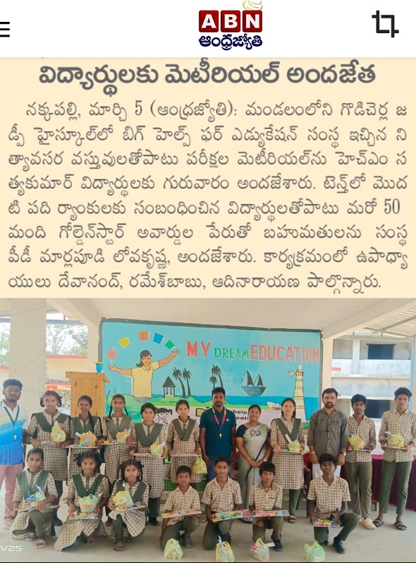 | 05-Mar-2026 News Published In Andhrajyothi On 05-Mar-2026 | | 05-Mar-2026 News Published In NewsToday On 05-Mar-2026 | | 12-Nov-2025 Bighelp Chairman Chand Pasha Sir Visited Z.P High School,Godicherla | | 12-Nov-2025 Bighelp Chairman Chand Pasha Sir Visited Z.P High School,Godicherla |