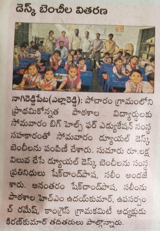 Head Master of Mandal Parishad Upper Primary School, Pocharam, Nagireddypet Mandal, Kamareddy district, Telangana requested to donate duel desks and one almirah for their school.